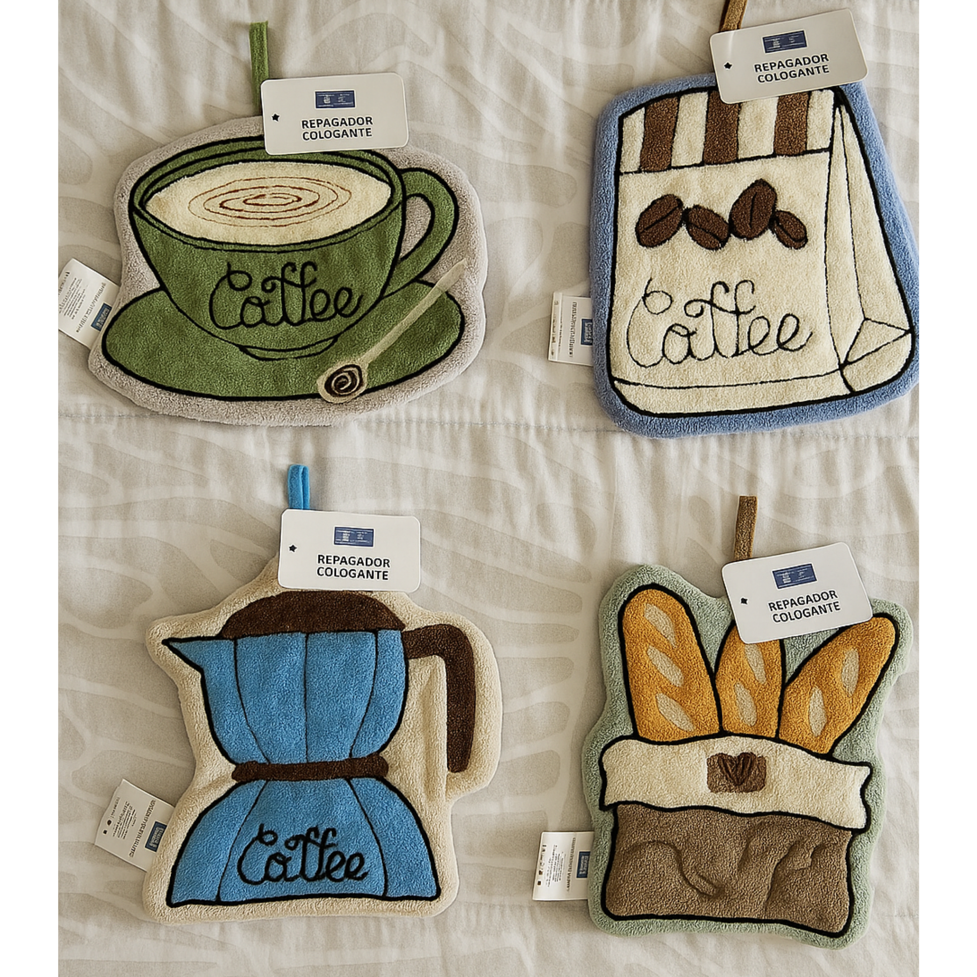 Transformá tu cocina con estos repasadores colgantes súper decorativos y funcionales. Inspirados en el estilo café de autor, cada diseño combina textura suave, detalles bordados y colores cálidos que aportan encanto a cualquier espacio.